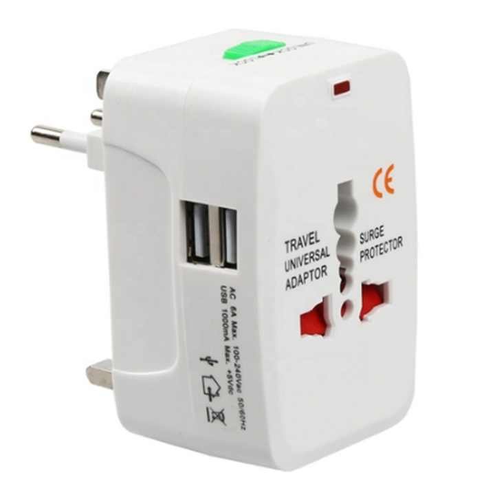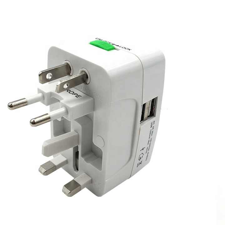 A versatile travel adapter with multiple plug configurations for global use, plus two built-in USB ports for charging devices directly.